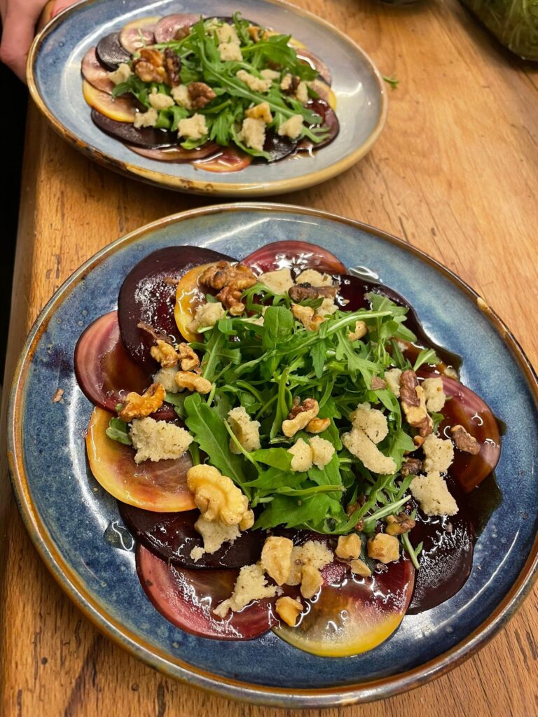 - 🥗 Appetiser: Pomegranate Glazed Beet Carpaccio with Roasted Walnuts, Vegan Feta & Rocket.