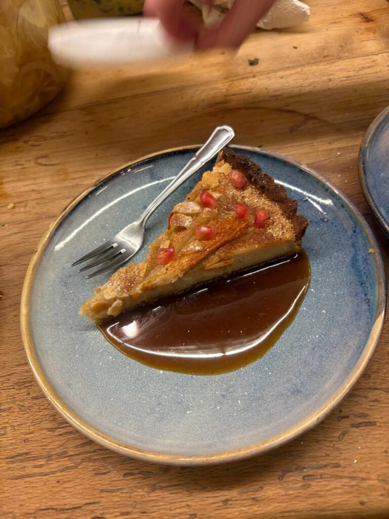 - 🍮 Dessert: Spiced Pear & Walnut Frangipane Tart with Vanilla Bean Cashew Cream and Apple Cider Ginger Caramel.