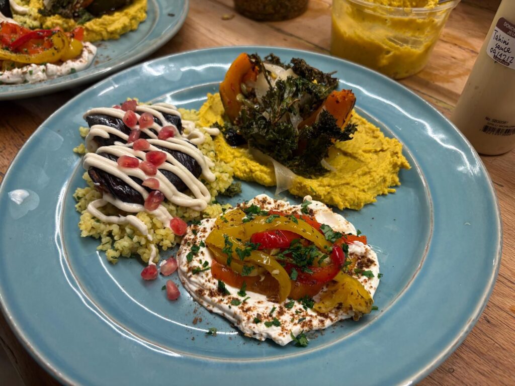 - 🍱 Main Course: Roasted Stuffed Eggplant with Tahini & Pomegranate, Bulgur with Butter & Parsley, Pumpkin Hummus, Confit Bell Peppers, Pickled Fennel, Seeds Salsa.